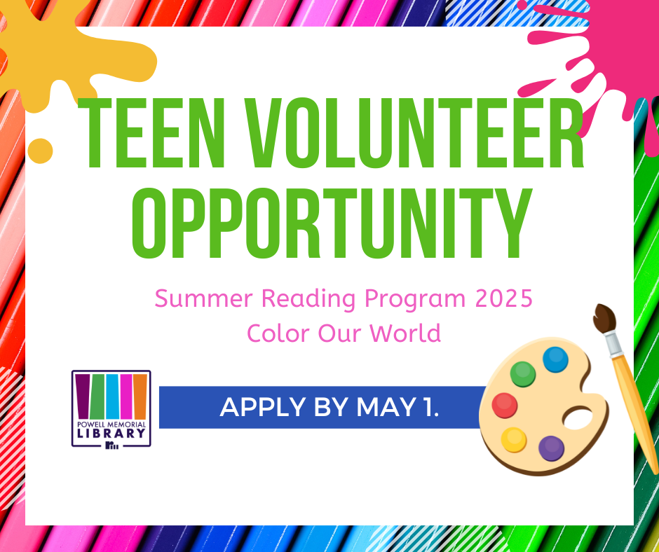 Looking for a fun and meaningful way to spend your summer? Powell Memorial Library needs teen volunteers for our Summer Reading Program — but time is running out! Earn service hours, gain leadership experience, and make a real impact in your community.